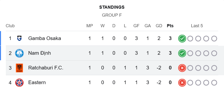 กลุ่ม F หลังนัดแรก กัมบะ โอซาก้า นำจ่าฝูง 3 แต้ม ประตูได้เสีย +2 เท่ากับ นัม ดินห์ ที่รั้งอันดับ 2 ด้วยผลต่างเท่ากัน ด้าน ราชบุรี อยู่อันดับ 3 ไร้แต้ม ประตูได้เสีย -2 เหนือ อีสเทิร์น เพียงประตูได้เสียเท่านั้น เกมต่อไปทุกคะแนนมีค่ามหาศาล โดยเฉพาะเกมเหย้า–เยือนกับคู่แข่งโดยตรง