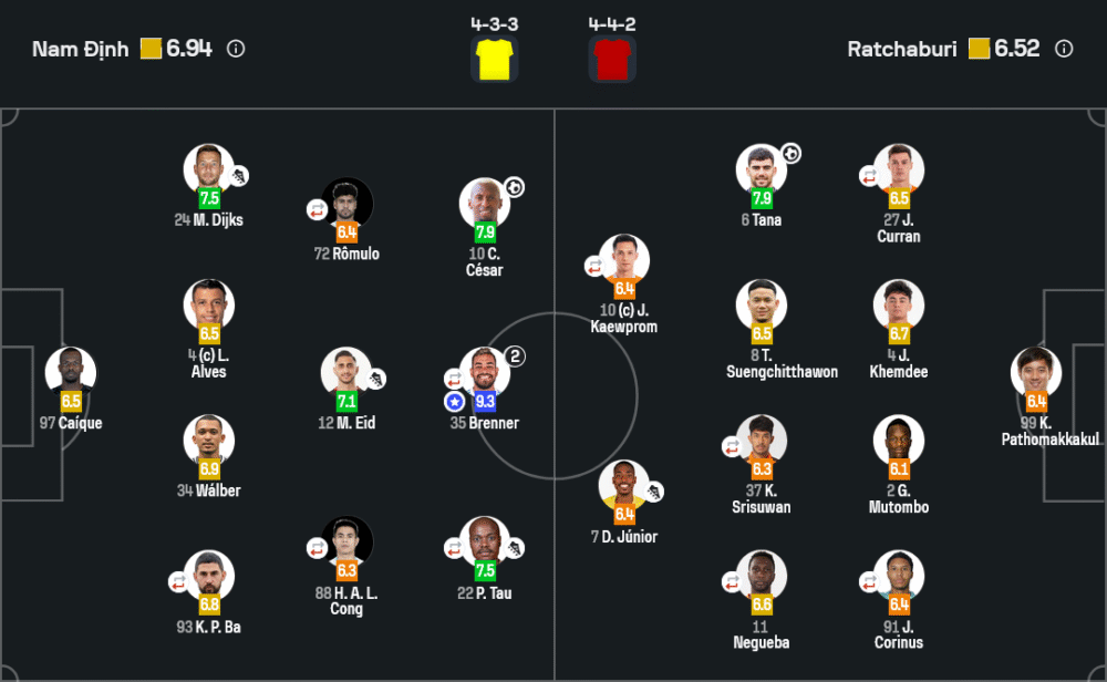 เบรนเนอร์ (นัม ดินห์) – ศูนย์หน้าบราซิลยืนค้ำอย่างหิวกระหาย สร้างความปั่นป่วนตลอด 90 นาที เหนี่ยวไกสองลูกในครึ่งหลัง หนึ่งโขก หนึ่งแป จังหวะหาช่องในกรอบเฉียบคม เรตติ้งพุ่ง 9.3 ชัดเจนว่าเป็นตัวแปรที่ทำให้รูปเกมเทน้ำหนักเข้าทางเจ้าบ้าน