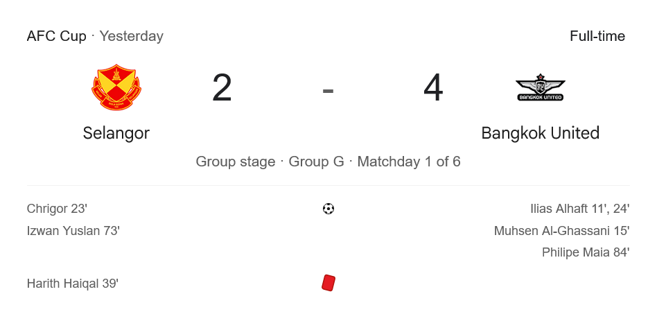 นาที 11 อิลิอัส อัลฮาฟต์ สอดเข้าไปรับบอลก่อนยิงไม่เหลือให้ทีมเยือนนำ 1-0 ตามด้วยนาที 15 มุห์เซน อัล-ฆัสซานี ชาร์จจ่อๆ จากการครอสของ จักพัน พิสมัย? (จารุวัฒน์?—ในภาพระบุ “J. Praisuwan”) ให้สกอร์ไหลเป็น 2-0 ทว่าบรรยากาศยังไม่จบ เซลังกอร์ได้เฮนาที 23 เมื่อ ชริกอร์ ยิงตีไข่แตก 1-2 จากการทำทางของ เควนติน เฉิง แต่เพียงนาที 24 อัลฮาฟต์กดเม็ดสองส่วนตัว ทรู แบงค็อก หนี 3-1 นาที 39 เจ้าถิ่นมาเหลือ 10 คน เมื่อ ฮาริธ ไหกาล โดนใบแดงจากจังหวะตัดเกมในฐานะ “โอกาสทำประตูชัดแจ้ง” ก่อนพักครึ่งจบที่ 1-3 โดยมีใบเหลืองของ ฟิลิเป้ ไมอา ช่วง 45+3