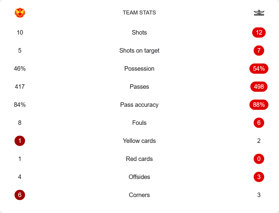เกมนี้ทั้งสองทีมสร้างโอกาสรวมกัน 22 ครั้ง เซลังกอร์ยิง 10 เข้ากรอบ 5 ขณะที่ทรู แบงค็อก แม่นกว่า ยิง 12 เข้ากรอบ 7 การครองบอลทีมเยือนเหนือกว่า 54% ต่อ 46% จ่ายบอล 498 ต่อ 417 และความแม่นยำ 88% ต่อ 84% ฟาวล์ใกล้เคียงกัน 6 ต่อ 8 เจ้าบ้านได้เตะมุมมากกว่า 6 ต่อ 3 แต่ต้องเล่น 10 คนตั้งแต่นาที 39 ทำให้ช่วงยาวของเกมต้องถอยรับลึก ใบเหลืองจบที่ 1 ต่อ 2 และมีใบแดงฝ่ายเดียวของเซลังกอร์