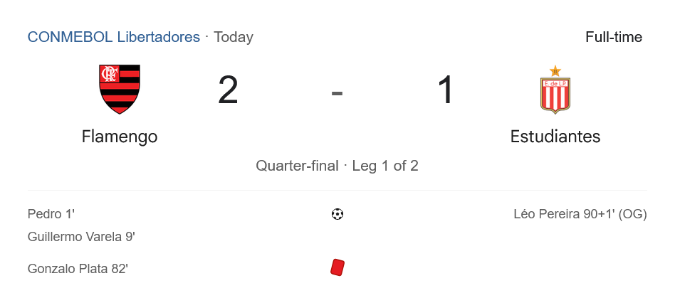 และแล้วช่วงทดเวลาบาดเจ็บนาที 90+1 เอสตูเดียนเตสได้เฮจากการทำเข้าประตูตัวเองของ เลโอ เปเรย์ร่า แนวรับฟลาเมงโก ทำให้สกอร์ไล่มาเป็น 2-1 ก่อนจบเกมแบบสุดมันส์ที่มาราคาน่า โดยเจ้าบ้านเก็บชัยได้ แต่เสียอเวย์โกล์ที่อาจส่งผลในเลกสอง
