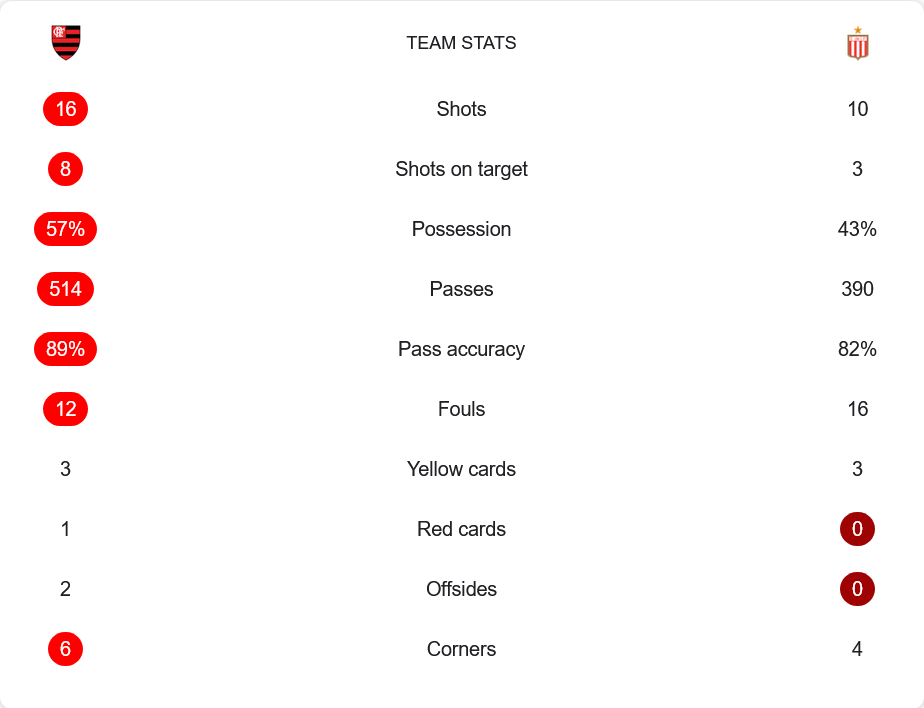 แม้ฟลาเมงโกจะครองบอลเพียง 57% แต่การเข้าทำมีประสิทธิภาพกว่า ยิงรวม 16 ครั้ง เข้ากรอบ 8 ครั้ง ตรงข้ามกับเอสตูเดียนเตสที่มีเพียง 10 ครั้ง และเข้ากรอบแค่ 3 ครั้ง การจ่ายบอลของเจ้าถิ่นแม่นยำถึง 89% จาก 514 ครั้ง ชัดเจนว่าพวกเขาคุมเกมกลางสนามได้ดีกว่า ขณะที่ทีมเยือนแม้จ่ายบอลแม่นถึง 82% แต่ยังสร้างโอกาสอันตรายได้น้อย