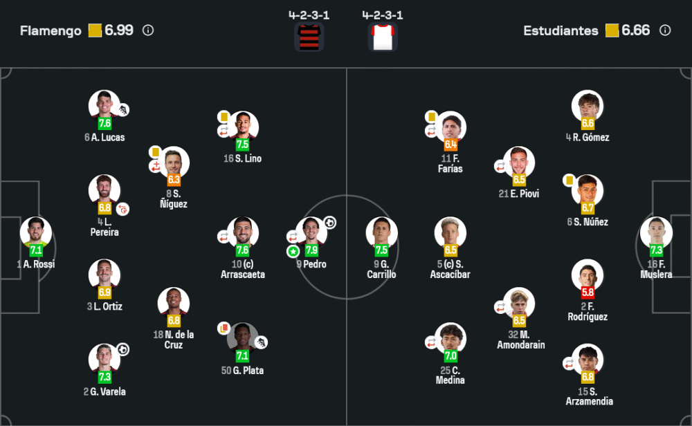 วิเคราะห์บอล เกมนี้ ฟลาเมงโกใช้ระบบ 4-2-3-1 ที่เน้นความหลากหลายในการเข้าทำ โดยมี อาร์ราสกาเอต้า คอยปั้นเกมและเชื่อมระหว่างกลางกับหน้าเป้า การขึ้นเกมริมเส้นของบาเรล่าและลิโน่สร้างปัญหาให้แนวรับเอสตูเดียนเตสชัดเจน ขณะที่ เปโดร เป็นจุดเปลี่ยนสำคัญในแดนหน้า