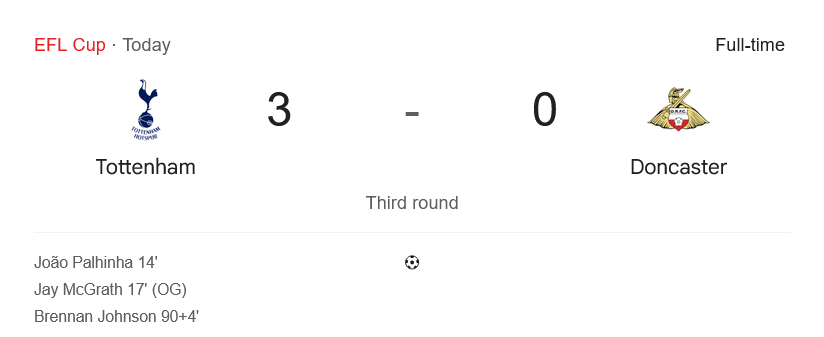 ศึกคาราบาวคัพรอบสามที่ท็อตแน่ม ฮ็อทสเปอร์ สเตเดียม แฟนบอลได้เห็นพลังเกมบุกของ “ไก่เดือยทอง” ที่กลับมาพร้อมความมั่นใจ เกมนี้ ผลบอลสด เปิดมาได้เพียง 14 นาที เจ้าถิ่นก็ปลดล็อกประตูแรกจากการยิงของ เจา ปาลินญ่า ที่กดเต็มข้อเสียบตาข่ายแบบไม่เหลือซาก จากนั้นแค่สามนาทีต่อมา ดอนคาสเตอร์ก็ช็อคเมื่อ เจย์ แม็กกราธ ทำเข้าประตูตัวเอง กลายเป็นสกอร์ 2-0 ตั้งแต่ต้นเกม ทำให้ผู้มาเยือนแทบจะหมดแรงต้านในทันที ก่อนจบครึ่งแรก สเปอร์สคุมบอลขึงเกมรุกเต็มที่ และปิด 45 นาทีแรกด้วยการนำ 2-0