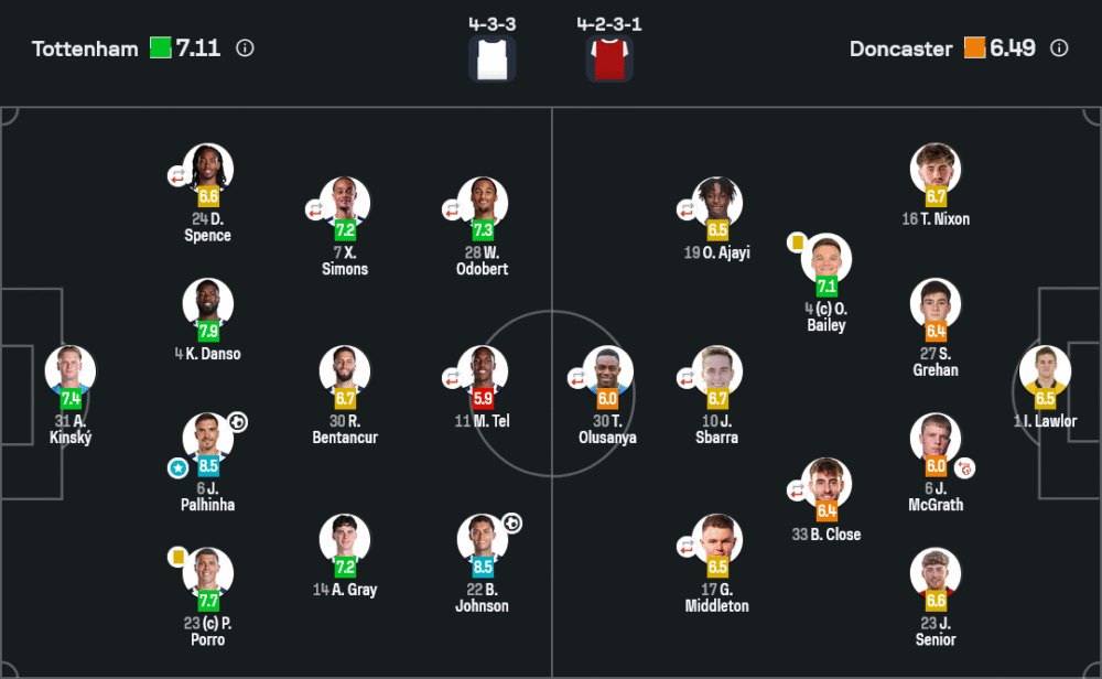 แม้ข้อมูลสถิติโดยรวมจะไม่ถูกบันทึกครบถ้วน แต่เกมนี้บ่งบอกชัดว่า สเปอร์สครองเกมได้อย่างเด็ดขาด สร้างโอกาสยิงมากกว่า ครองบอลเหนือกว่า และมีความแม่นยำในการจบสกอร์ โดยเฉพาะการประสานงานแดนกลางที่ทำให้คู่แข่งไม่สามารถตั้งเกมได้เลย ขณะที่ดอนคาสเตอร์แทบไม่มีจังหวะยิงตรงกรอบเลยทั้งเกม