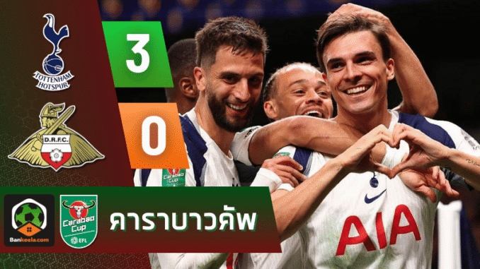 ศึกคาราบาวคัพรอบสามที่ท็อตแน่ม ฮ็อทสเปอร์ สเตเดียม แฟนบอลได้เห็นพลังเกมบุกของ “ไก่เดือยทอง” ที่กลับมาพร้อมความมั่นใจ เกมนี้ ผลบอลสด เปิดมาได้เพียง 14 นาที เจ้าถิ่นก็ปลดล็อกประตูแรกจากการยิงของ เจา ปาลินญ่า ที่กดเต็มข้อเสียบตาข่ายแบบไม่เหลือซาก จากนั้นแค่สามนาทีต่อมา ดอนคาสเตอร์ก็ช็อคเมื่อ เจย์ แม็กกราธ ทำเข้าประตูตัวเอง กลายเป็นสกอร์ 2-0 ตั้งแต่ต้นเกม ทำให้ผู้มาเยือนแทบจะหมดแรงต้านในทันที ก่อนจบครึ่งแรก สเปอร์สคุมบอลขึงเกมรุกเต็มที่ และปิด 45 นาทีแรกด้วยการนำ 2-0