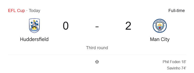 ชัยชนะนี้ส่งผลให้ แมนฯ ซิตี้ ผ่านเข้ารอบต่อไปของคาราบาวคัพแบบมั่นใจ โดยยังคงรักษาผลงานยอดเยี่ยมต่อเนื่องทั้งในลีกและบอลถ้วย ส่วน ฮัดเดอร์ฟิลด์ ต้องหันไปโฟกัสในลีกวันและฟุตบอลถ้วยอื่น ๆ ต่อไป
