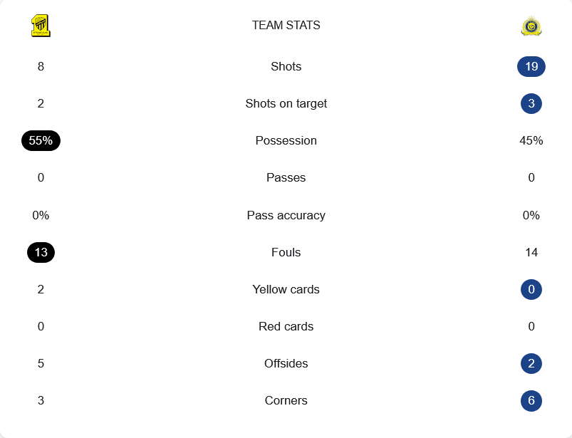 เกมนี้ อัล อิติฮัด ครองบอลมากกว่า 55% แต่ยิงเพียง 8 ครั้ง เข้ากรอบแค่ 2 ขณะที่ อันนัศร์ ใช้จังหวะโต้กลับอย่างคม ยิง 19 ครั้ง เข้ากรอบ 3 และทำได้ถึง 2 ประตู ทีมเยือนมีลูกเตะมุมมากกว่า (6 ต่อ 3) และเล่นเกมรับมีวินัย ไม่เสียใบเหลืองเลย ขณะที่เจ้าถิ่นโดน 2 ใบ เกมนี้ไม่มีใบแดง และมีฟาวล์รวม 27 ครั้ง