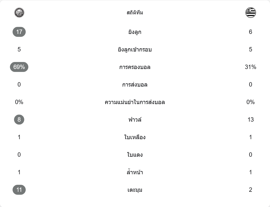 ตัวเลขชัดเจนบ่งบอกภาพเกม — โอเปราริโอครองบอลถึง 69% ยิงทั้งหมด 17 ครั้ง เข้ากรอบ 5 ครั้ง ส่วนแอธเลติกครองบอลเพียง 31% แต่ยิงเข้ากรอบ 5 ครั้งเช่นกัน และเปลี่ยนเป็น 4 ประตูได้ทั้งหมด ความเฉียบคมนี้คือสิ่งที่สร้างความแตกต่างอย่างแท้จริง เกมฟาวล์มีรวมถึง 21 ครั้ง และทั้งสองทีมโดนใบเหลืองทีมละหนึ่ง