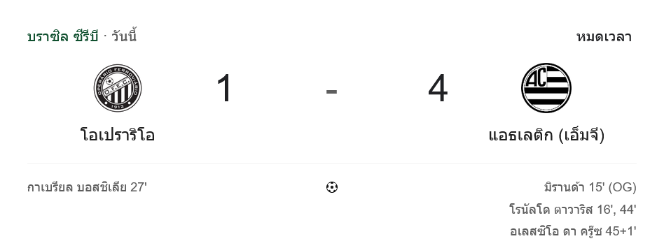 ศึก คัมปิโอนาโต บราซิเลียโร ซีรีบี เกมเมื่อคืนนี้จบลงด้วยความมันสะใจแฟนบอล เมื่อ แอธเลติก เอ็มจี โชว์ฟอร์มสุดโหด บุกอัด โอเปราริโอ แฟร์โรวิอาริโอ พีอาร์ ถึงถิ่น 4-1 ในเกมที่สนามเอสตาดิโอ เกอร์มาน อากีลาร์ โดยมี เวลินตัน ดาวยิงตัวเก่งรับบทฮีโร่ ยิงสองประตูสุดเฉียบพาทีมเก็บ 3 แต้มสำคัญ พร้อมขยับไล่จี้กลุ่มหัวตารางแบบหายใจรดต้นคอ สกอร์นี้สะท้อนภาพความเด็ดขาดและการจบสกอร์ที่เฉียบขาดของทีมเยือนอย่างแท้จริง แฟนๆ บ้านผลบอล ต่างเทใจให้ว่านี่คือเกมที่ “เอ็นเตอร์เทน” ที่สุดของสัปดาห์ในศึกซีรีบี