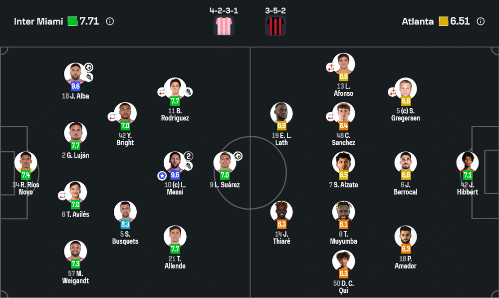 ลิโอเนล เมสซี่ คือพระเอกของเกมนี้ ยิง 2 แอสซิสต์ 1 และคุมจังหวะเกมได้ทั้งสนาม ได้คะแนนสูงสุด 9.6 เป็นเกมที่เจ้าตัวโชว์คลาสระดับโลกอีกครั้ง พร้อมปลุกไฟให้แฟนไมอามีเชื่อมั่นว่า ทีมนี้มีลุ้นไกลในฤดูกาลนี้