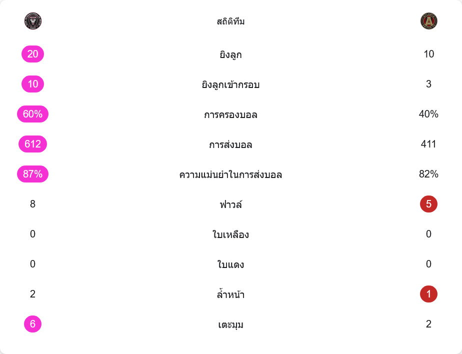 อินเตอร์ ไมอามี ครองบอลได้มากถึง 60% ส่งบอล 612 ครั้ง ความแม่นยำในการจ่าย 87% สร้างโอกาสยิงได้ถึง 20 ครั้ง เข้ากรอบ 10 ครั้ง ขณะที่ แอตแลนต้า ยูไนเต็ด ครองบอลเพียง 40% ยิง 10 ครั้ง เข้ากรอบ 3 ครั้ง และแทบไม่มีจังหวะบุกที่อันตรายมากนัก เป็นเกมที่ตัวเลขชี้ชัดถึงความเหนือชั้นของเจ้าถิ่นในทุกมิติ