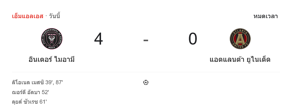 บ้านผลบอล สรุปหลังเกม เมเจอร์ลีกซอกเกอร์เดือด! เมสซียิงสอง-แอสซิสต์อีก พาอินเตอร์ ไมอามี ถล่ม แอตแลนต้า ยูไนเต็ด 4-0 ลุ้นพื้นที่เพลย์ออฟ