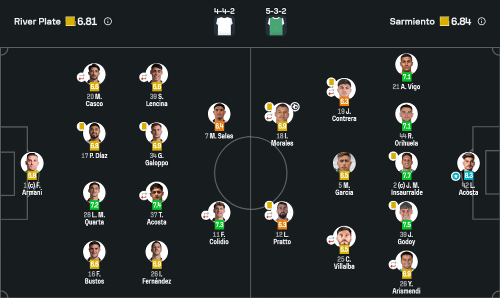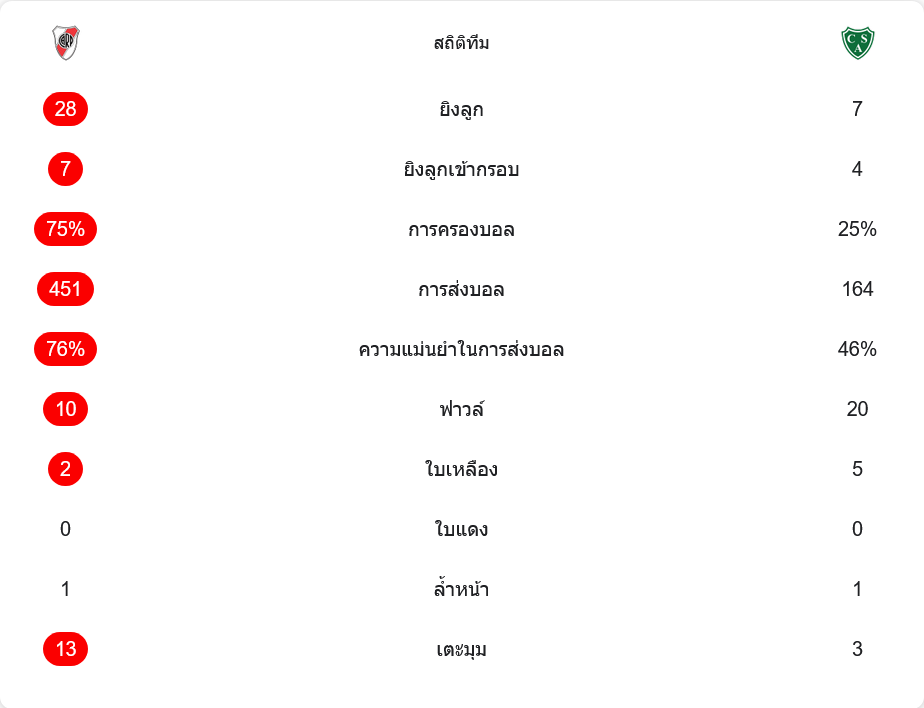 แม้จะเป็นฝั่งเจ้าบ้านที่ไล่บี้ตลอดทั้งเกม แต่ตัวเลขชี้ชัดว่า ซาร์เมียนโต้เล่นเกมรับได้แข็งแกร่งสุด ๆ โดยริเวอร์เพลทครองบอล 75% ส่งบอล 451 ครั้ง ความแม่นยำ 76% ยิง 28 ครั้ง แต่ไม่สามารถเจาะตาข่ายได้ ขณะที่ซาร์เมียนโต้ยิงเพียง 7 ครั้ง เข้ากรอบ 4 ครั้งแต่ได้ประตูเดียวที่เพียงพอในการคว้าชัย นอกจากนี้ ทีมเยือนยังโดนใบเหลืองถึง 5 ใบ เทียบกับเจ้าบ้านที่ได้ 2 ใบ บ่งบอกถึงเกมที่ต้องใช้ความเข้มข้นสูงสุดตลอด 90 นาที