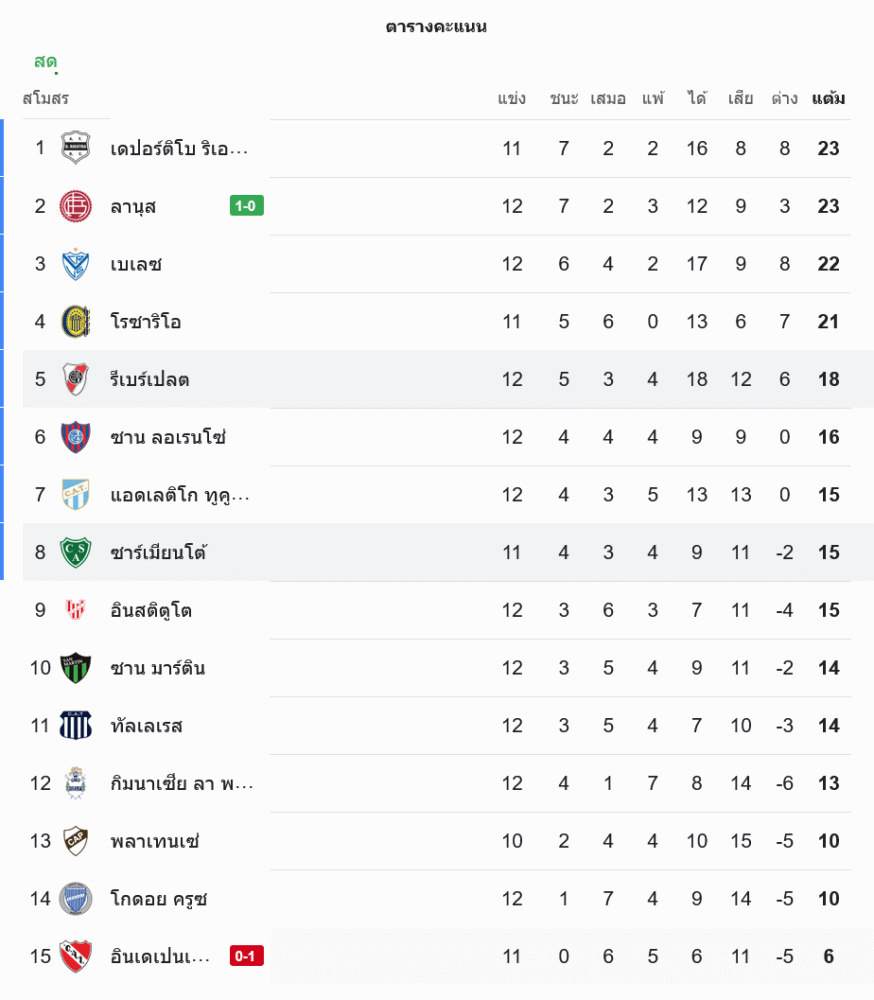 หลังจบเกมนี้ ริเวอร์เพลท ยังคงอยู่อันดับ 4 ของตาราง มี 21 แต้มจาก 11 นัด พลาดโอกาสทองในการทำแต้มไล่จี้จ่าฝูง ส่วน ซาร์เมียนโต้ เก็บเพิ่มเป็น 15 แต้มจาก 11 นัด กระโดดขึ้นมาอยู่อันดับ 8 ของตาราง อาจเป็นจุดเปลี่ยนสำคัญในการลุ้นท็อป 5 ช่วงท้ายซีซั่น