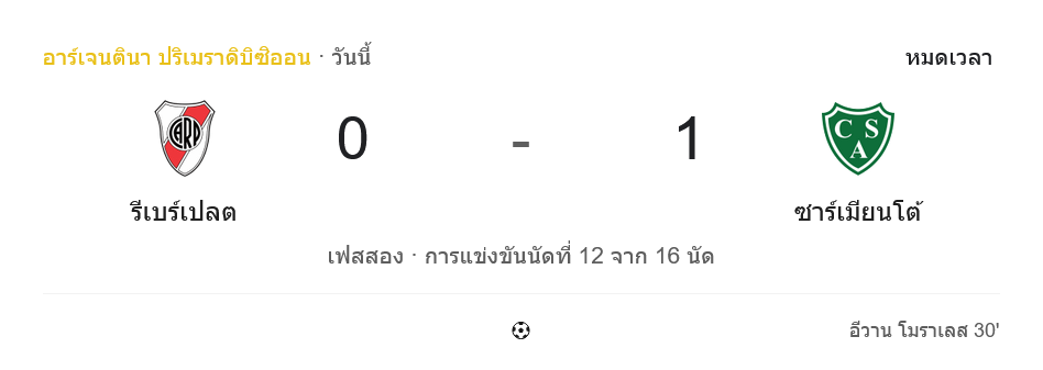 ศึก อาร์เจนติน่า พรีเมียร์ดิวิชั่น เกิดดราม่ากลางสนามมอนูเมนทัล เมื่อ ริเวอร์เพลท ที่ครองเกมเกือบทั้งแมตช์ กลับถูกทีเด็ดของ อีวาน โมราเลส เล่นงานตั้งแต่นาที 30 ก่อนจะโดน ซาร์เมียนโต้ บุกเชือด 0-1 คาบ้านแบบสุดช็อก ส่งเสียงเตือนแรงไปทั่วลีก ขณะที่แฟนบอลเจ้าถิ่นต้องกลืนความขมกับ ผลบอลสด สุดพลิกล็อกในค่ำคืนนี้