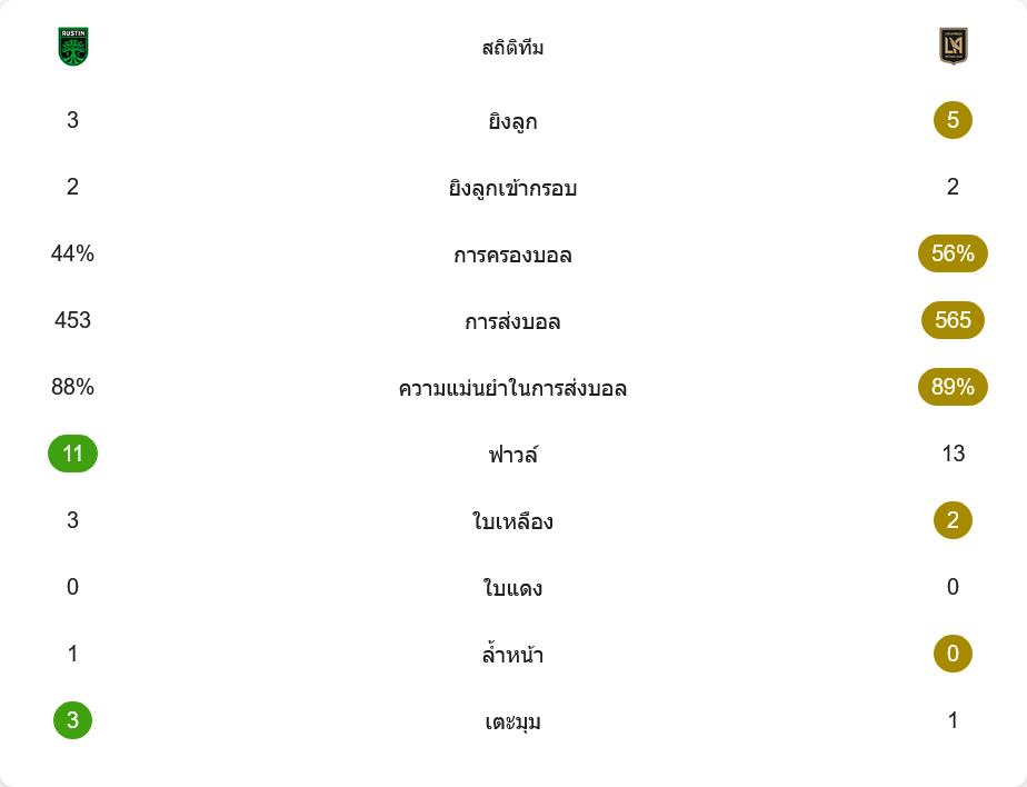 แม้ ลอสแอนเจลิส เอฟซี จะครองบอลมากกว่า 56% และจ่ายบอลถึง 565 ครั้ง เทียบกับเจ้าบ้านที่ครองบอลเพียง 44% แต่ทั้งสองทีมยิงเข้ากรอบเท่ากันที่ 2 ครั้ง แสดงให้เห็นถึงความแน่นอนในการป้องกันของฝั่งออสติน ขณะที่เกมรับของ ลอสแอนเจลิส ก็เล่นได้ดีแต่พลาดเพียงครั้งเดียวที่ต้องจ่ายด้วยประตู เกมนี้ยังมีใบเหลืองรวม 5 ใบ แบ่งเป็นออสติน 3 ใบ และลอสแอนเจลิส 2 ใบ บ่งบอกถึงความเข้มข้นของแมตช์อย่างแท้จริง