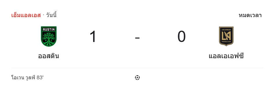 ศึก เมเจอร์ลีก ซอกเกอร์ (MLS) คืนนี้เดือดไม่แพ้เกมระดับยุโรป เมื่อ ออสติน เอฟซี เปิดบ้านเฉือนเอาชนะ ลอสแอนเจลิส เอฟซี ไปแบบหืดจับ 1-0 จากประตูสุดเฉียบของ โอเวน วูล์ฟ ในนาทีที่ 83 ส่งเสียงเฮสนั่นสนามและสร้างแรงกระตุ้นมหาศาลให้แฟนบอลทั้งเมือง ผลนี้ทำให้บรรยากาศหลังจบเกมร้อนแรงสุด ๆ และเป็นอีกหนึ่งแมตช์ที่ ผลบอลสด กลายเป็นประเด็นพูดถึงในวงการ MLS ทันที