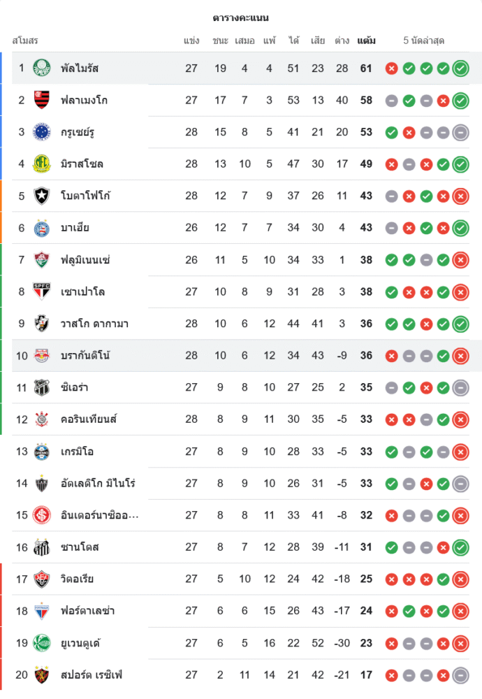 สามแต้มวันนี้ทำให้พัลไมรัสทะยานนำฝูงต่อด้วย 61 คะแนนจาก 27 นัด ทิ้งห่างฟลาเมงโกที่ 58 คะแนน กดดันคู่แข่งโดยตรงก่อนโปรแกรมหนักถัดไป ส่วน RB บรากันติโน้หยุดที่ 36 คะแนน หล่น/ยึดโซนกลางตารางรอบที่ 10 โอกาสลุ้นพื้นที่ทวีปยังมีแต่ต้องรีดฟอร์มให้คงเส้นคงวากว่านี้