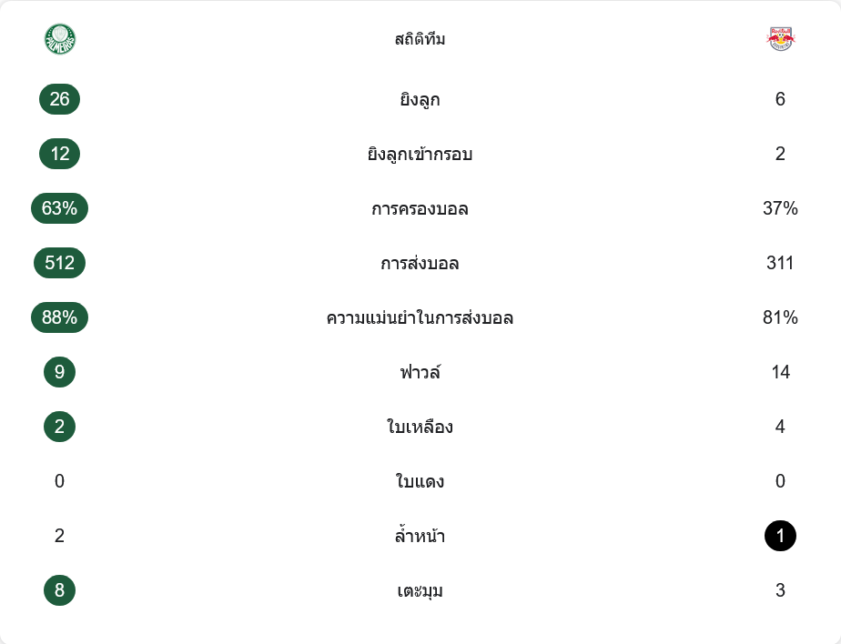 ภาพรวมบอกชัดว่าเจ้าถิ่นเหนือกว่าทุกมิติ พัลไมรัสยิงทั้งสิ้น 26 ครั้ง เข้ากรอบ 12 คุมบอล 63% ต่อบอลสำเร็จ 88% จาก 512 ครั้ง แถมได้ลูกตั้งเตะบีบเกม 8 เตะมุม ขณะที่บรากันติโน้มีโอกาสเพียง 6 ครั้ง เข้ากรอบ 2 ครองบอล 37% ผ่านบอล 311 ครั้ง ความแม่นยำ 81% และถูกบีบจนต้องตัดฟาวล์ถึง 14 ครั้ง ใบเหลืองรวม 4 เทียบกับเจ้าบ้าน 2 ใบ ตัวเลขทั้งหมดสะท้อนความดุดันและความเฉียบคมของจ่าฝูงแบบไม่เถียง