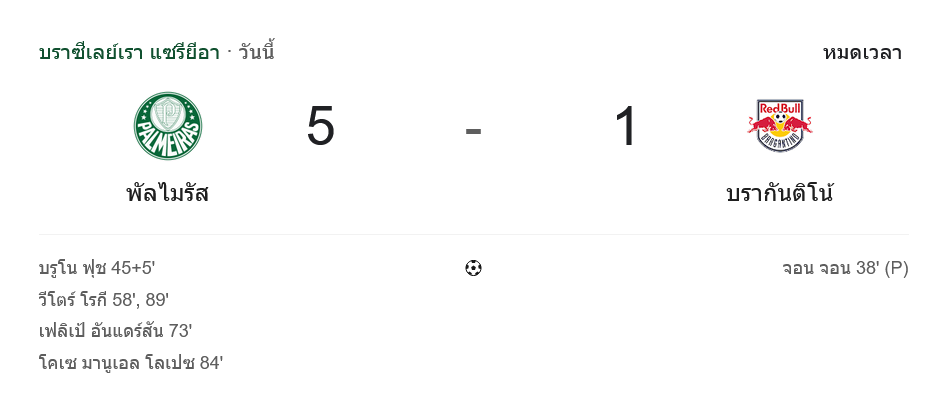 พัลไมรัสเพิ่มสปีดและความหลากหลายในการเข้าทำ นาที 58 วิตอร์ โรเก้ กดนิ่ม ๆ แซง 2-1 ก่อนนาที 73 เฟลิเป้ อันเดอร์สัน แทงทะลุช่อง–สอดจบคม 3-1 เกมรับทีมเยือนเริ่มเปิดช่อง นาที 84 โฆเซ่ โลเปซ ลงมายิงไม่จับเป็น 4-1 และนาที 89 โรเก้ ซัดเบิ้ลปิดกล่อง 5-1 สะใจแฟนเจ้าถิ่นสุด ๆ จบเกมด้วยสกอร์มโหฬารที่สะท้อนระยะห่างของคุณภาพในวันฟอร์มติดดาบของจ่าฝูง