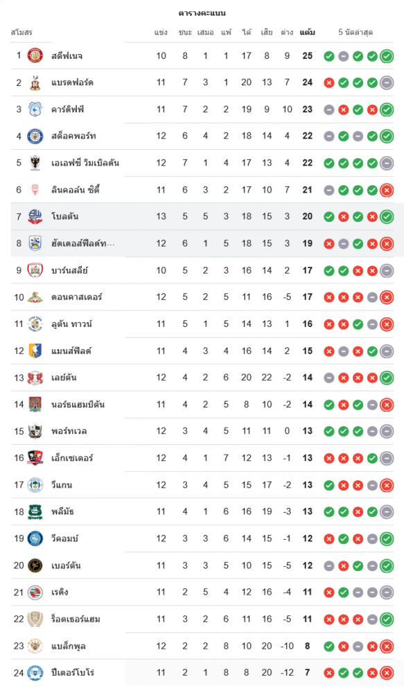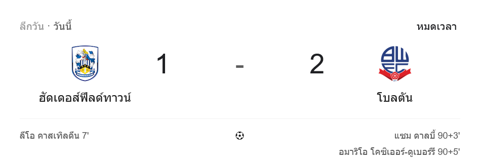 สามแต้มสุดระทึกพา โบลตัน มี 20 คะแนนจาก 13 นัด ขยับอยู่อันดับ 7 ไล่จี้โซนเพลย์ออฟต่อเนื่อง ส่วน ฮัดเดอร์ฟิลด์ คงที่ที่ 19 คะแนนจาก 12 นัด อยู่แถวหัวตารางกลางๆ แต่ต้องรีบคืนความนิ่งช่วงท้ายหากไม่อยากเสียแต้มง่าย