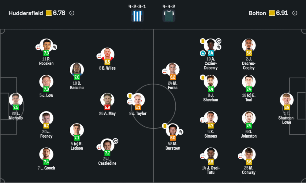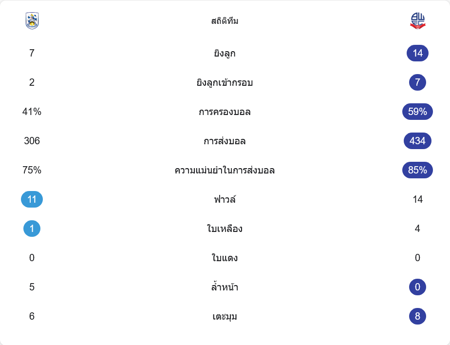 รูปเกมสะท้อนว่าโบลตันบุกมากกว่าอย่างมีนัย ยิงรวม 14 ครั้ง เข้ากรอบ 7 ขณะที่เจ้าบ้านมี 7 ครั้ง เข้ากรอบ 2 การครองบอลทีมเยือน 59% ต่อ 41% ส่งบอลสำเร็จ 85% เหนือกว่า 75% ของฮัดเดอร์ฟิลด์ ลูกนิ่งและความกดดันช่วงท้ายเห็นชัดจากเตะมุม 8-6 ให้โบลตัน แม้ฟาวล์ทีมเยือนมากกว่า 14-11 และโดนใบเหลือง 4-1 แต่ความเฉียบคมในช่วงทดเวลาบาดเจ็บคือคีย์ที่ชี้ขาดผล