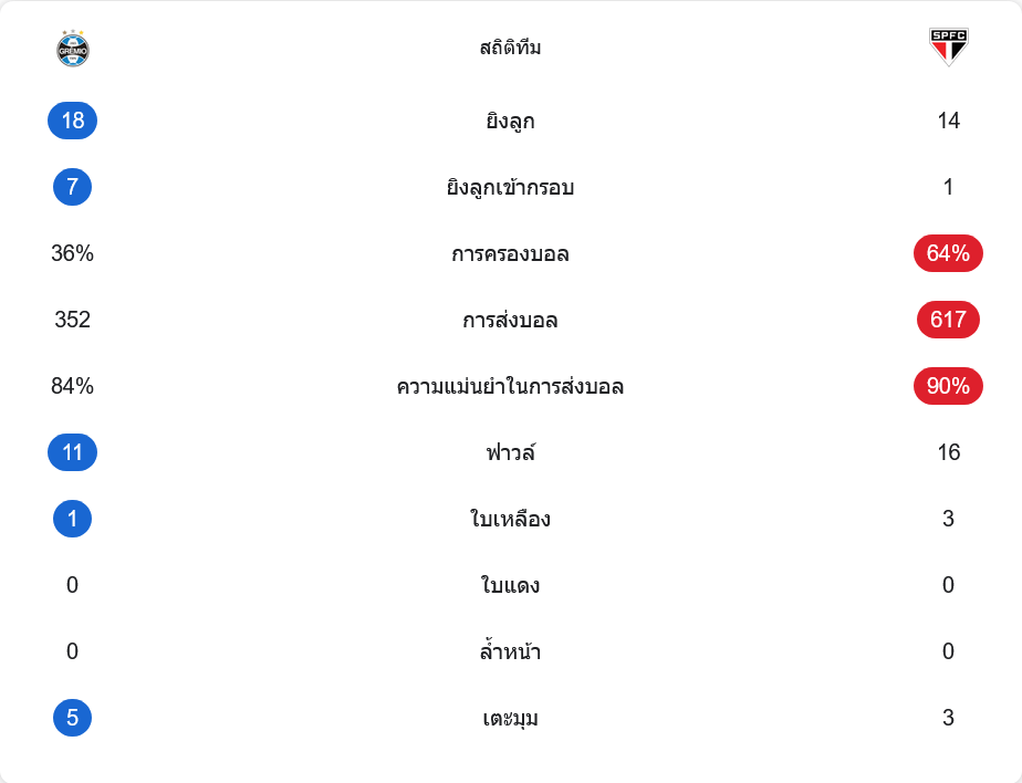 แม้สกอร์จะขาดลอยแต่รูปเกมไม่ได้ง่าย เซาเปาโลมีการครองบอลมากกว่าที่ 64% และส่งบอลแม่นยำถึง 90% แต่โอกาสจบสกอร์กลับมีเพียง 14 ครั้งและเข้ากรอบแค่ 1 หน ในขณะที่เกรมิโอ้มีโอกาสยิงถึง 18 ครั้ง เข้ากรอบ 7 ครั้ง ครองบอลเพียง 36% แต่มีความเฉียบคมและเปลี่ยนจังหวะสวนกลับเป็นประตูได้ทั้งสองลูก ทีมเยือนฟาวล์มากกว่าที่ 16 ครั้ง เทียบกับเจ้าบ้าน 11 ครั้ง ขณะที่ใบเหลืองตกเป็นของเซาเปาโลมากถึง 3 ใบ ซึ่งสะท้อนถึงแรงกดดันในเกมที่สูงมาก