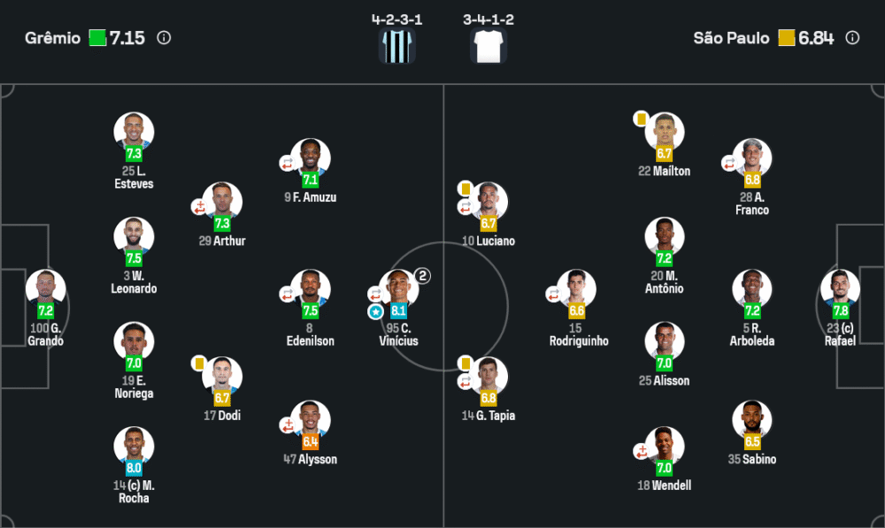 คาร์ลอส วินิซิอุส ดาวยิงของเกรมิโอ้ คือฮีโร่ของค่ำคืนนี้ ด้วยผลงานเหมาคนเดียว 2 ประตู ยิงคมเฉียบขาดและเคลื่อนที่ปั่นป่วนแนวรับเซาเปาโลตลอดทั้งเกม คว้าคะแนนความสามารถสูงสุด 8.1 จาก Sofascore พาทีมยึดชัยแบบไร้ข้อกังขา