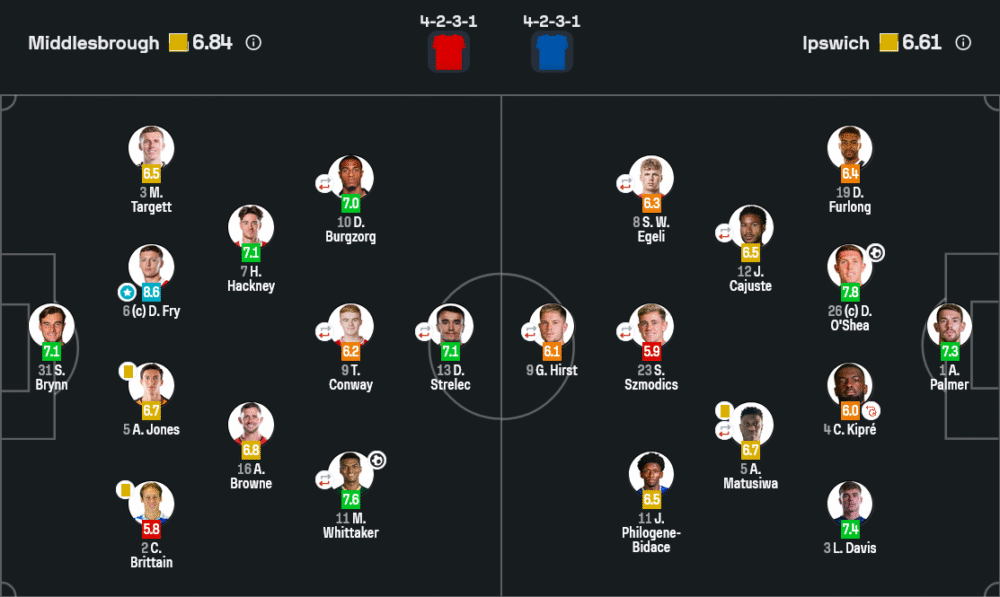 ดาเอล ฟราย (Dael Fry) ปราการหลังตัวเก่งของมิดเดิลสโบรห์ คว้าตำแหน่ง Man of the Match ด้วยคะแนน 8.6 โดดเด่นทั้งลูกกลางอากาศและการเข้าปะทะ อ่านเกมขาด ช่วยทีมรักษาสกอร์จนจบเกม