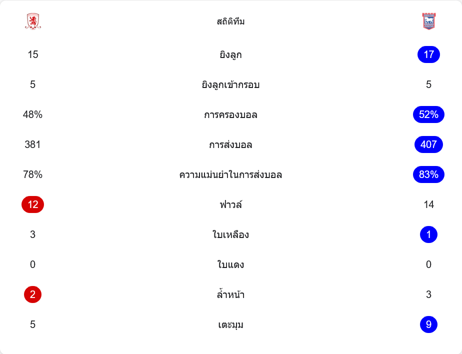 ตลอดทั้งเกม มิดเดิลสโบรห์ ยิงทั้งหมด 15 ครั้ง เข้ากรอบ 5 ครั้ง ครองบอล 48% ผ่านบอล 381 ครั้ง ความแม่นยำ 78% ทำฟาวล์ 12 ครั้ง ได้เตะมุม 5 ครั้ง ส่วนอิปสวิชยิงมากกว่า 17 ครั้ง เข้ากรอบเท่ากัน 5 ครั้ง ครองบอล 52% ผ่านบอล 407 ครั้ง ความแม่นยำ 83% ทำฟาวล์ 14 ครั้ง ได้เตะมุม 9 ครั้ง ถือเป็นเกมที่อิปสวิชพยายามบุกมากกว่าแต่ไม่เฉียบคมเท่าเจ้าบ้าน