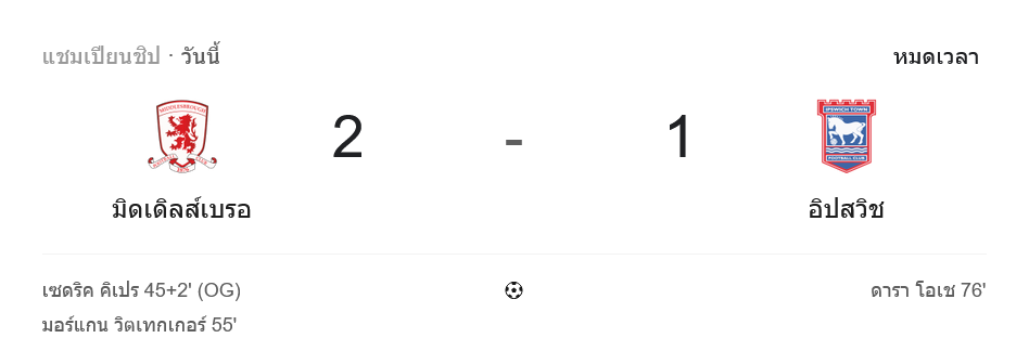 ศึก แชมเปียนชิป อังกฤษ คืนนี้เต็มไปด้วยความเข้มข้น มิดเดิลสโบรห์ เปิดรังรับการมาเยือนของ อิปสวิช ทาวน์ เกมนี้แฟนบอลติดตาม ผลบอลสด อย่างดุเดือดตั้งแต่นาทีแรก แม้รูปเกมจะสูสี แต่เจ้าบ้านเป็นฝ่ายคุมจังหวะได้ดีกว่า และจบครึ่งแรกด้วยการออกนำ 1-0 จากจังหวะสุดดราม่าในช่วงทดเจ็บนาที 45+2 ที่ เซดริก คิเปร ของอิปสวิช สกัดบอลพลาดเข้าประตูตัวเอง ทำให้สนามแทบระเบิดจากเสียงเฮของเจ้าถิ่น