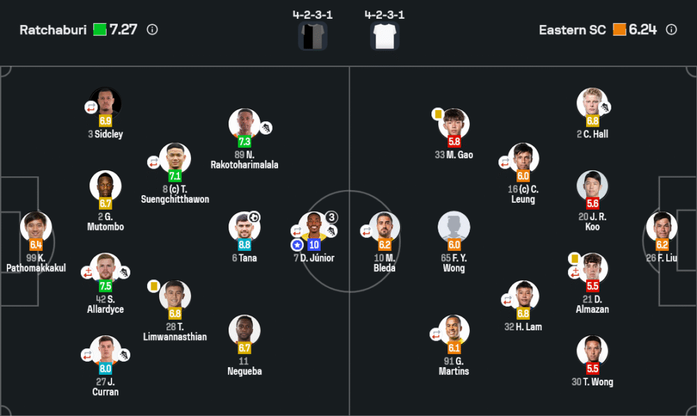 เดนี จูเนียร์ (ราชบุรี) คะแนนเต็มสิบ เกมนี้ยืนเป็นเพลย์เมคเกอร์หน้าต่ำแต่ทะลุไปปิดสกอร์ได้ถึง 3 ลูก อ่านช่องว่างระหว่างเซ็นเตอร์–โฮลดิ้งมิดฟิลด์คู่แข่งขาด วางตัวในฮาล์ฟสเปซถูกจังหวะ ทั้งคมทั้งขยัน กดดันแนวรับอีสเทอร์นจนพังเป็นระยะ