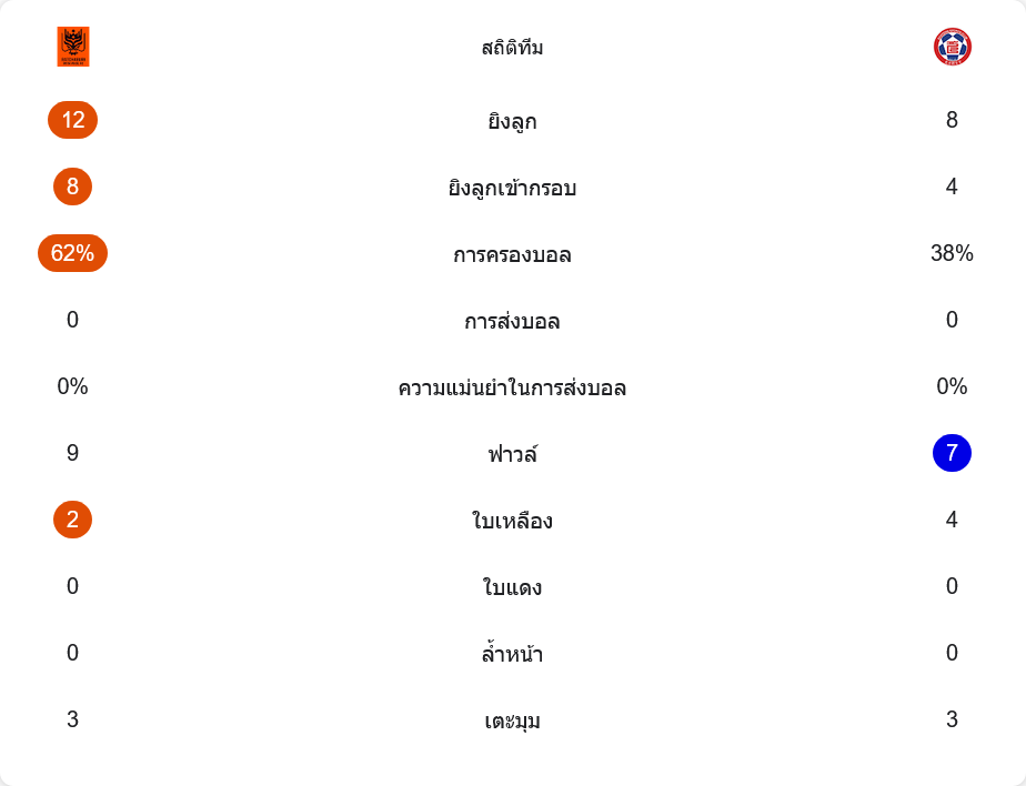 ราชบุรียิง 12 ครั้ง เข้ากรอบ 8 ครั้ง ได้ครองบอลถึง 62% บีบพื้นที่และเปลี่ยนจังหวะบุกได้หลากหลาย ขณะที่อีสเทอร์นมีโอกาส 8 ครั้ง เข้ากรอบ 4 ครั้ง อาศัยเกมสวนและการวิ่งทำทางของตัวสำรองเป็นหลัก ตัวเลขฟาวล์ค่อนข้างสูสี 9 ต่อ 7 ใบเหลืองเจ้าบ้าน 2 ใบ ทีมเยือน 4 ใบ ลูกเตะมุมเท่ากัน 3 ต่อ 3 สะท้อนภาพรวมว่าเจ้าบ้านคุมเกมรุก ส่วนทีมเยือนต้องตั้งรับลึกยาวนาน