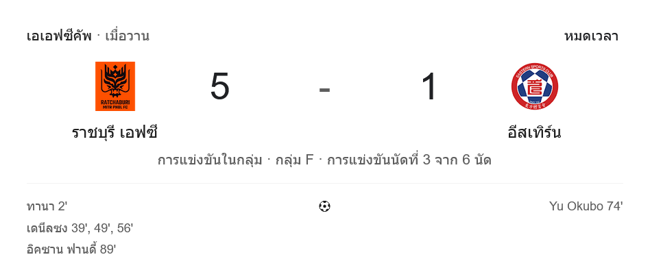 จาก : ผลบอลสด เอเอฟซี แชมเปี้ยนส์ลีก อีลิท ทู ระหว่าง ราชบุรี เอฟซี 5-1 อีสเทอร์น เอ.เอ ฟุตบอล วันนี้ 22/10/68 – บ้านกีฬา