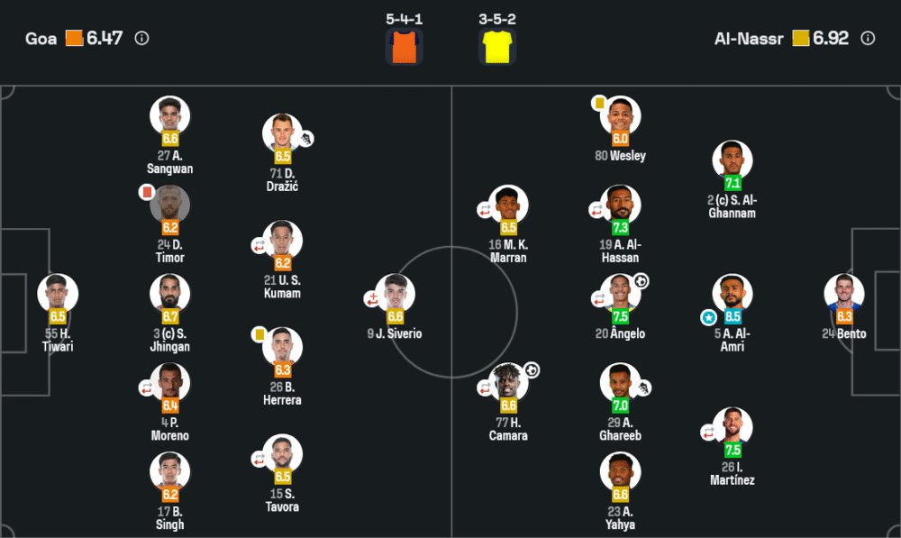 จอร์จ เชซุสสั่งลูกทีมคุมจังหวะและเปลี่ยนยกชุดกลางครึ่งหลัง ส่ง ซาดิโอ มาเน่, ชูเอา เฟลิกซ์ และ อับดุลเลาะห์ อัล-คอไฮบารี ลงมาย้ำความแน่น เจ้าบ้านพยายามโยนยาวและลุ้นจากฟรีคิก แต่แนวรับที่มี อับดุลอิลาห์ อัล-อมรี คุมแผงหลังไว้แน่นหนา ส่วนทดเจ็บ 90+2 เดวิด ตีมอร์ ของกัวไปมีปัญหากับผู้ตัดสินถูกไล่ออก จบเกมอัล นาสร์บุกชนะ 2-1