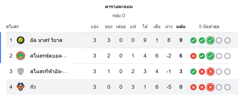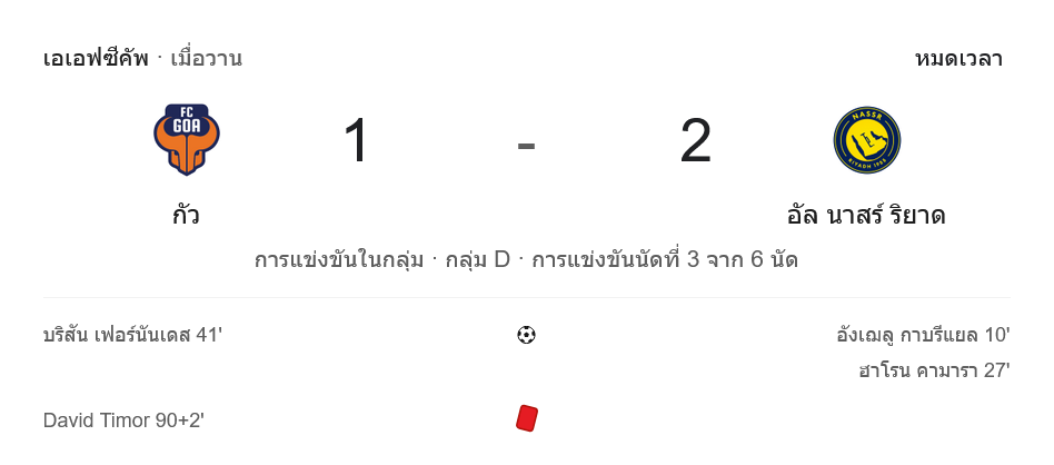 สามแต้มทำให้อัล นาสร์ชนะ 3 นัดรวด นำฝูงกลุ่ม D มี 9 คะแนน ประตูได้เสีย +8 โอกาสเข้ารอบสดใสเต็มร้อย ขณะที่เอฟซี กัวยังไร้แต้มจาก 3 เกม ยิงได้ 1 เสีย 6 รั้งอันดับสุดท้าย งานหนักรออยู่หากหวังลุ้นพื้นที่เข้ารอบ