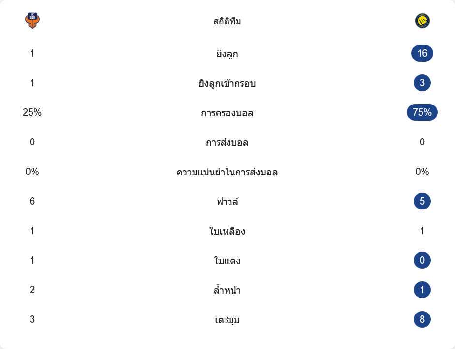 ตัวเลขตอกย้ำรูปเกมชัดเจน กัวยิงทั้งแมตช์เพียง 1 ครั้ง เข้ากรอบ 1 ครองบอล 25% ขณะที่อัล นาสร์ผลิตสถิติ 16 ครั้ง เข้ากรอบ 3 ครองบอล 75% เกมคุมโดยทีมเยือนเกือบทั้งหมด ลูกตั้งเตะอย่างเตะมุม 8 ต่อ 3 ชี้ว่าการบุกต่อเนื่องและความกดดันในพื้นที่สุดท้ายเป็นของอัล นาสร์ตลอด แม้จำนวนฟาวล์ใกล้เคียง 6 ต่อ 5 แต่การจัดระเบียบหลังบ้านของทีมนำทำได้เนียนกว่า
