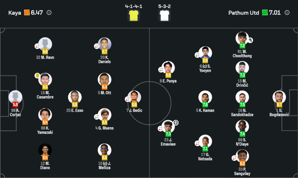 ทั้งสองทีมใช้แผนแตกต่างกันชัด คายาเล่น 4-1-4-1 เน้นเกมรุกทางปีกสองข้าง แต่ติดปัญหาความแม่นยำจังหวะสุดท้าย ส่วน บีจี ปทุม ยูไนเต็ด มาในระบบ 5-3-2 เน้นรัดกุมและสวนกลับเร็ว เมื่อได้ประตูนำตั้งแต่ต้นเกมก็สามารถคุมแท็คติกได้หมดจด เกมรับของบีจีแข็งแกร่ง โดยเฉพาะ คามาน และ แซนด็อกฮัดเซ ที่หยุดจังหวะอันตรายได้หลายครั้ง การประสานงานของแนวรุกโดยมี นอตสึดะ และ อีมาไวเว เป็นตัวขับเคลื่อนเกมสวนกลับถือว่าคมกว่าฝั่งเจ้าถิ่นอย่างชัดเจน เกมนี้จึงเป็นภาพสะท้อนของความแตกต่างด้านแท็คติกอย่างแท้จริง เหมาะอย่างยิ่งกับสาย วิเคราะห์บอล ที่ชื่นชอบการดูแท็คติกดิบ ๆ