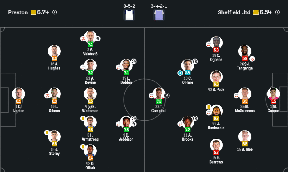 คัลลัม โอแฮร์ (Callum O’Hare) เพลย์เมกเกอร์ของเชฟฯ ยูไนเต็ด รับรางวัล ผู้เล่นยอดเยี่ยมประจำเกม ด้วยคะแนนสูงถึง 8.4 แม้ทีมจะแพ้แต่เจ้าตัวโชว์ฟอร์มเด่นทั้งยิงประตูและสร้างโอกาสหลายครั้ง เป็นจุดศูนย์กลางของเกมรุกที่เพรสตันรับมือได้ยาก