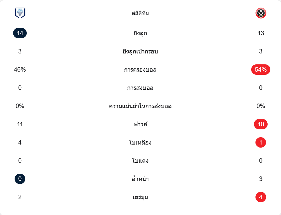แม้เชฟฯ ยูไนเต็ดจะครองบอลเหนือกว่าที่ 54% และยิงเข้ากรอบ 3 ครั้งเท่ากับเพรสตัน แต่เจ้าบ้านกลับมีจังหวะยิงรวมถึง 14 ครั้ง สร้างโอกาสได้ชัดเจนกว่า เกมนี้มีใบเหลืองรวมถึง 5 ใบ และไม่มีใบแดง การฟาวล์ของทั้งสองทีมถือว่าสูสี (เพรสตัน 11 ครั้ง / เชฟฯ ยูไนเต็ด 10 ครั้ง) เกมจบลงด้วยชัยชนะของเพรสตันที่ใช้จังหวะสวนกลับได้เฉียบขาดกว่า