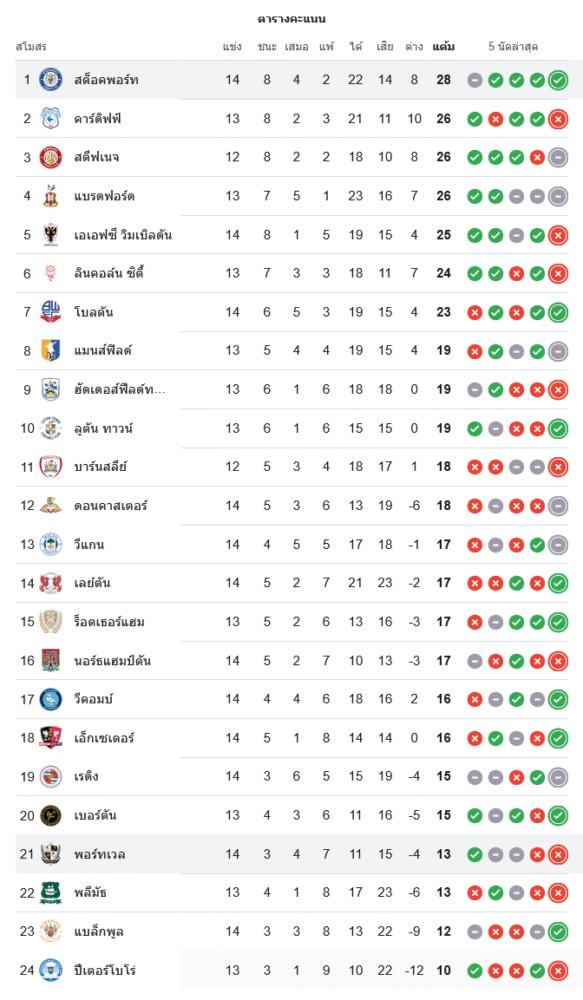 ชัยชนะเกมนี้ส่ง สต็อคพอร์ท เคาน์ตี นำเป็นจ่าฝูงอย่างเหนียวแน่นด้วย 28 คะแนนจาก 14 นัด ขณะที่ พอร์ทเวล ยังจมอยู่ท้ายตารางอันดับ 21 มีเพียง 13 คะแนน สถานการณ์เริ่มน่าเป็นห่วง เพราะแต้มหลุดมือในบ้านอีกครั้ง