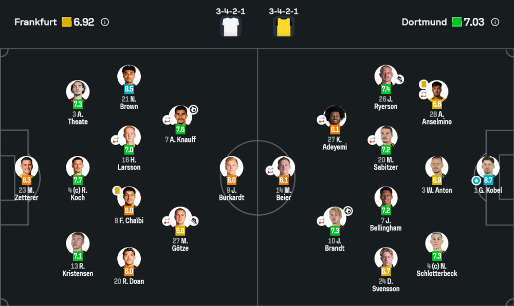 ทั้งสองทีมยืน 3-4-2-1 เหมือนกัน ทำให้บทเรียนเชิงแท็กติกคือการชิงพื้นที่ริมเส้น วิงแบ็กของแฟร้งค์เฟิร์ตอย่าง บราวน์ สร้างความได้เปรียบทางซ้ายด้วยสปีดและการครอส แต่ BVB รับมือด้วยการขยับซือเลอเข้ามาช่วยบล็อกโซนฮาล์ฟส페ซทันทีหลังพักครึ่ง เกมรุกเจ้าบ้านพึ่งการต่อบอลสั้นแล้วแทงช่องให้คเนาฟฟ์โฉบหลังแบ็ก ขณะที่ทีมเยือนเน้นทรานซิชันเร็ว บอลจังหวะสองจาก ซาบิตเซอร์-เบลลิงแฮม แล้วดันไรเยอร์สันเติมปิดงาน การตั้งรับของแฟร้งค์เฟิร์ตเป็นบล็อกกลางต่ำ 5 คนเมื่อเสียบอล ส่วนดอร์ทมุนด์พัฒนาจากครึ่งแรกอย่างเห็นได้ชัด—ไลน์กองหลังกระชับ, ปิดระยะระหว่างไลน์ และปล่อยให้ โกเบล จัดการบอลครอสที่หลุดมาได้หมด จุดตัดสินชัดเจนในเชิง วิเคราะห์บอล คือคุณภาพผู้รักษาประตูและความนิ่งตอนดวลโทษ ซึ่ง BVB เหนือกว่านิดเดียวแต่คมกว่ามาก