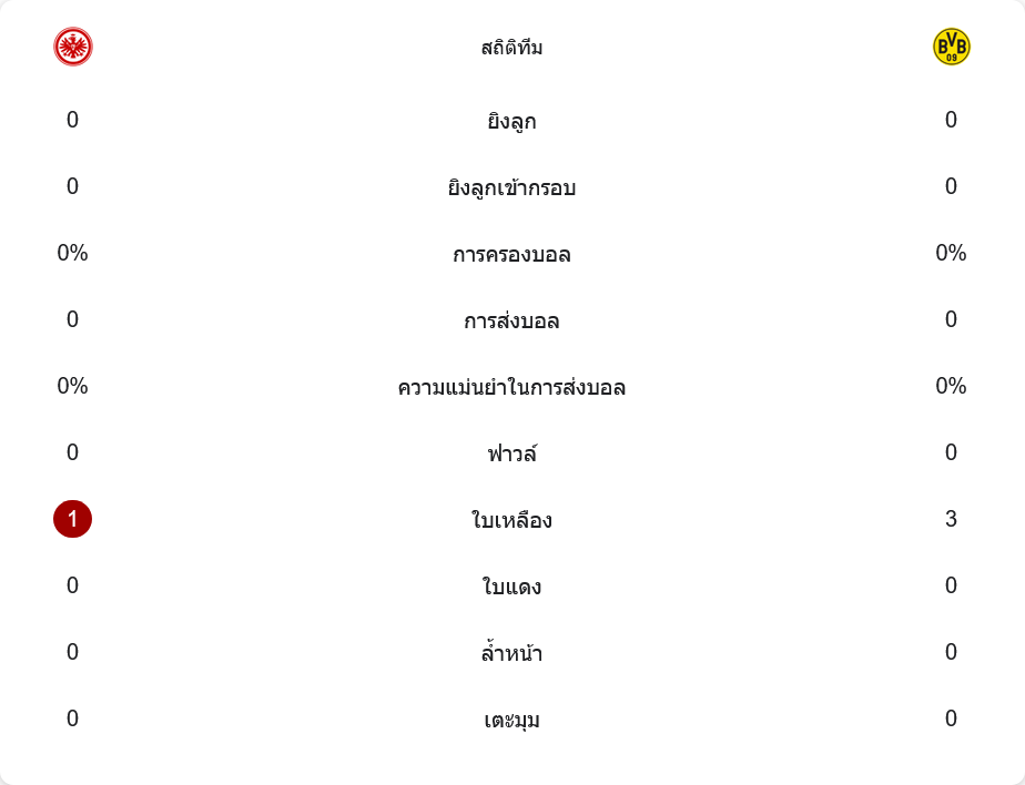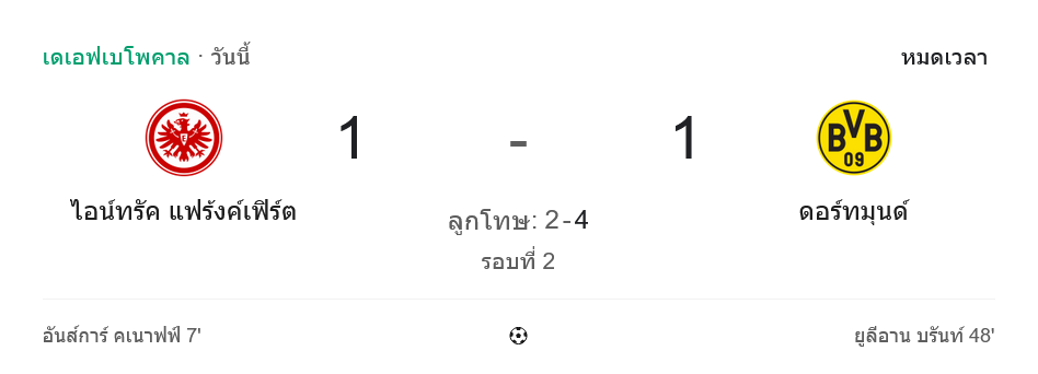 เกมนี้รูปเกมตึงเป๊ะ โอกาสยิงไม่ได้ล้นทะลักอย่างที่คาด การครองบอลสลับกันกดดันเป็นช่วงๆ จังหวะหวือหวาส่วนใหญ่เกิดจากการสวนกลับและลูกครอส ใบเหลืองรวมทั้งแมตช์ 4 ใบ—แฟร้งค์เฟิร์ต 1 ใบ ขณะที่ดอร์ทมุนด์ 3 ใบ ไม่มีใบแดง ไม่มีล้ำหน้า และไม่มีเตะมุมให้ลุ้นแบบได้เสียวตลอดทั้งเกม ทุกอย่างชี้ว่าทั้งสองทีมระมัดระวังและอ่านหมากกันขาด จนต้องไปชี้ขาดที่จุดโทษ