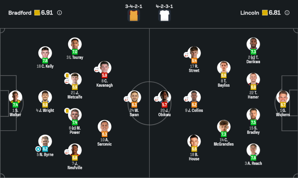 ในเชิง วิเคราะห์บอล เกมนี้แบรดฟอร์ดใช้แผน 3-4-2-1 ที่เน้นแน่นในแดนกลางและเล่นเพรสสูงในบางช่วง ขณะที่ลินคอล์นยึดแผน 4-2-3-1 ใช้เกมริมเส้นและการต่อบอลเร็วเข้าทำ จุดแข็งของแบรดฟอร์ดคือแนวรับที่ประสานงานดีเยี่ยม โดยเฉพาะคู่เซ็นเตอร์ เบิร์น กับ เคลลี่ ที่แทบไม่เปิดช่องให้คู่แข่ง ส่วนลินคอล์นแม้มีการครองบอลน้อยกว่าแต่จังหวะสวนกลับยังสร้างความอันตรายได้ดี เกมนี้จึงออกมาเสมอเพราะต่างฝ่ายต่างมีวินัยเกมรับสูงมาก