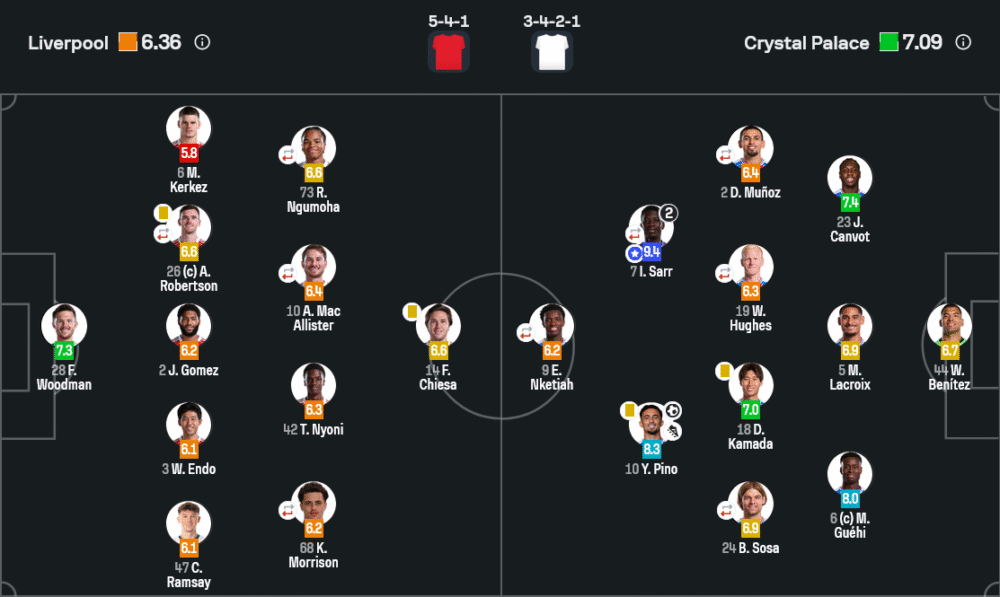 อิสไมล่า ซาร์ร์ – เรต 9.4 ปั่นป่วนตลอดเกม ใช้สปีดฉีกรอยต่อระหว่างแบ็กกับเซ็นเตอร์ ยิงสองเม็ดในช่วงสำคัญพลิกเมนตัมทั้งหมดให้ทีมเยือน ก่อนถูกถอดพักครึ่งหลัง ถือเป็นบทเรียนราคาแพงของแนวรับลิเวอร์พูลที่ปล่อยพื้นที่ด้านหลังมากเกินไป