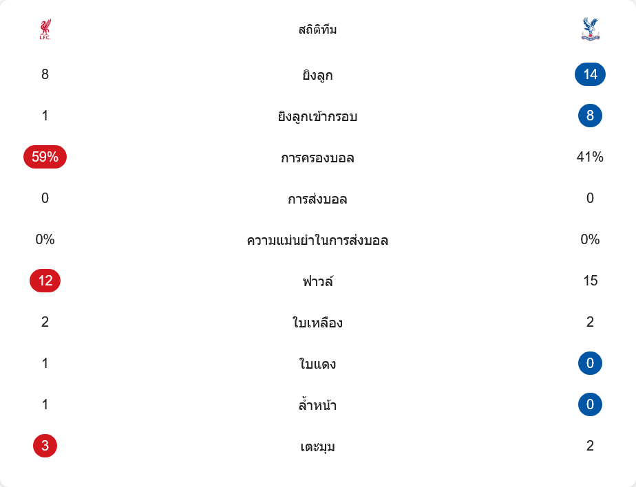 ตัวเลขบอกเรื่องราวครบ ลิเวอร์พูลครองบอล 59% แต่จบเพียง 8 ครั้ง เข้ากรอบแค่ 1 ครั้ง ขณะที่พาเลซยิง 14 ครั้ง เข้ากรอบถึง 8 ครั้ง สะท้อนความเฉียบคมที่ต่างชั้น ฟาวล์สูสี 12 ต่อ 15 ใบเหลืองฝั่งละ 2 แต่หงส์งานเข้าเพราะใบแดงนาที 79 ลูกเตะมุมหงส์ 3 ครั้ง ทีมเยือน 2 ครั้ง เกมนี้ชัดว่าพาเลซคมกว่าและรับเป็นระบบจนเจ้าบ้านหาช่องเจาะไม่ได้