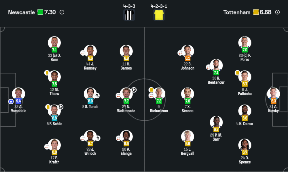 เกมนี้ “สาลิกาดง” เล่นในระบบ 4-3-3 ที่สมดุลระหว่างเกมรุกและเกมรับอย่างยอดเยี่ยม การเชื่อมบอลของ โตนาลี และการดันสูงของ คราฟท์-เบิร์น ทำให้ทีมครองเกมแดนกลางได้ตลอด ส่วนเกมรับใช้การยืนโซนและปิดช่องยิงของ ริชาร์ลิซอน ได้ดี ขณะที่สเปอร์สของ โธมัส แฟรงค์ เน้นเกมสวนกลับเร็วในระบบ 4-2-3-1 โดยใช้ความเร็วของ เบนจามิน จอห์นสัน และ เบอร์กวัลล์ แต่จังหวะสุดท้ายขาดความคมและติดเซฟของ แรมส์เดล ที่อยู่ในฟอร์มสุดโหด การวิเคราะห์บอลในเกมนี้ชี้ชัดว่านิวคาสเซิ่ลเล่นได้มีวินัยกว่าและคมกว่าทั้งสองฝั่งสนาม