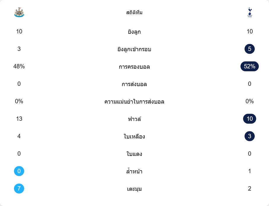 ทั้งสองทีมยิงรวมกัน 20 ครั้งเท่ากัน โดยนิวคาสเซิ่ลยิงเข้ากรอบ 3 ส่วนสเปอร์สทำได้ 5 แต่จังหวะสำคัญถูกเซฟไว้ได้หมด การครองบอลใกล้เคียงกัน เจ้าบ้าน 48% ทีมเยือน 52% ฟาวล์รวม 23 ครั้ง ใบเหลืองรวม 7 ใบ แสดงให้เห็นถึงความเข้มข้นตลอดเกม ขณะที่นิวคาสเซิ่ลได้ลูกเตะมุม 7 ครั้ง มากกว่าสเปอร์สที่มีเพียง 2 ครั้ง