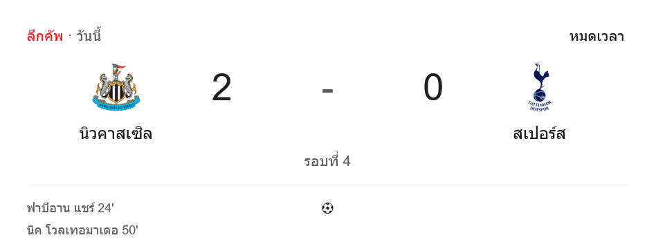 ศึกคาราบาวคัพรอบ 4 ที่สนามเซนต์เจมส์พาร์ก “สาลิกาดง” นิวคาสเซิ่ล ยูไนเต็ด เปิดบ้านรับการมาเยือนของ “ไก่เดือยทอง” ท็อตแน่ม ฮ็อทสเปอร์ เกมนี้ บ้านกีฬา เกาะติด ผลบอลสด กันแบบเข้มข้น ก่อนจบลงด้วยชัยชนะของเจ้าบ้าน 2-0 จากลูกยิงสุดเฉียบของ ฟาเบียน แชร์ และ นิก โวลเทอมาเด พาทีมทะลุรอบ 8 ทีมได้อย่างสง่างาม